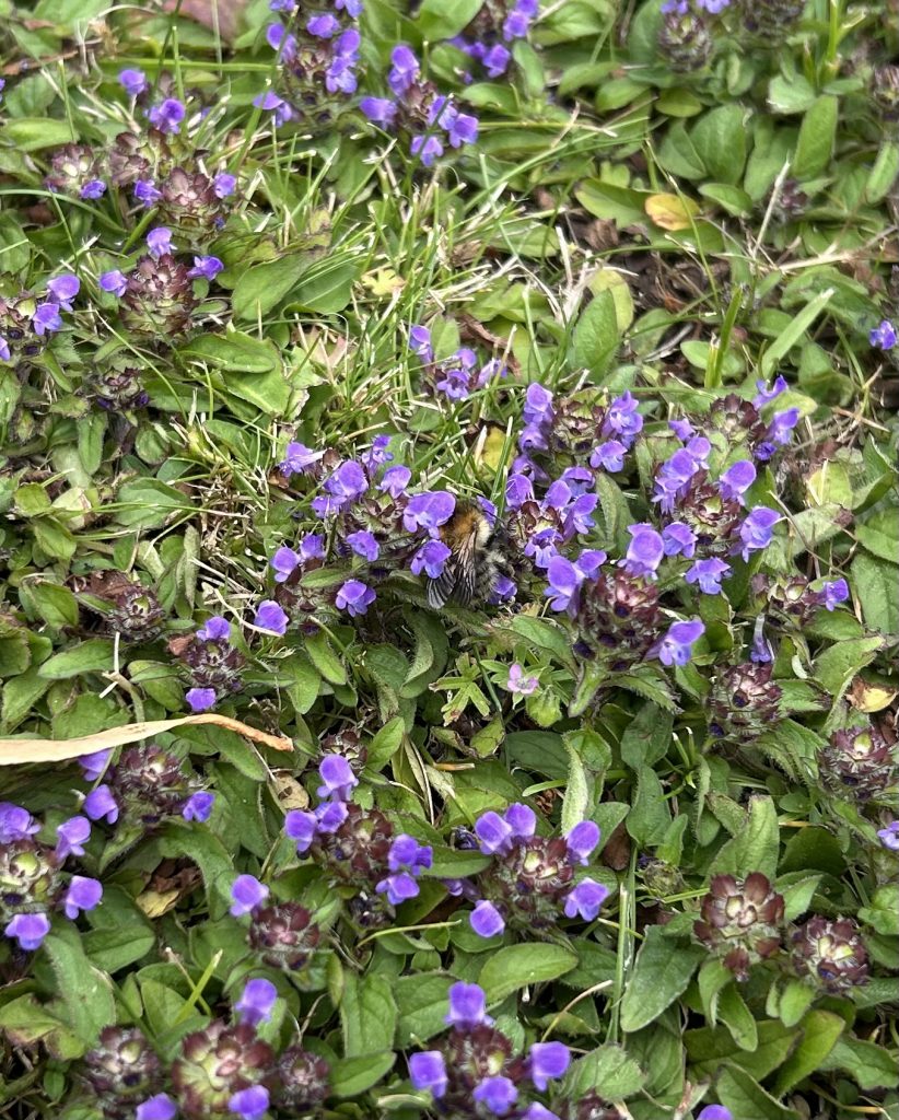 A bumblebee collecting nectar from wildflowers on the lawn.